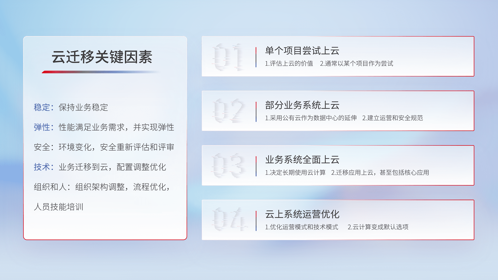 结合实际业务,,,从规划设计、、、、云平台选型、、云原生改造、、数据迁移、、集成交付,,,,迁移全过程为客户识别最佳上云路径,,做好风险识别管理,,设计网络架构、、身份权限、、、安全审计合规、、、操作审计、、、日志审计、、、、监控告警策略、、、多站点容灾设计等,,,,对云上基础设施进行整体规划,,,提升IT治理水平,,,以满足弹性、、、、高可用、、、高性能的需求。。。