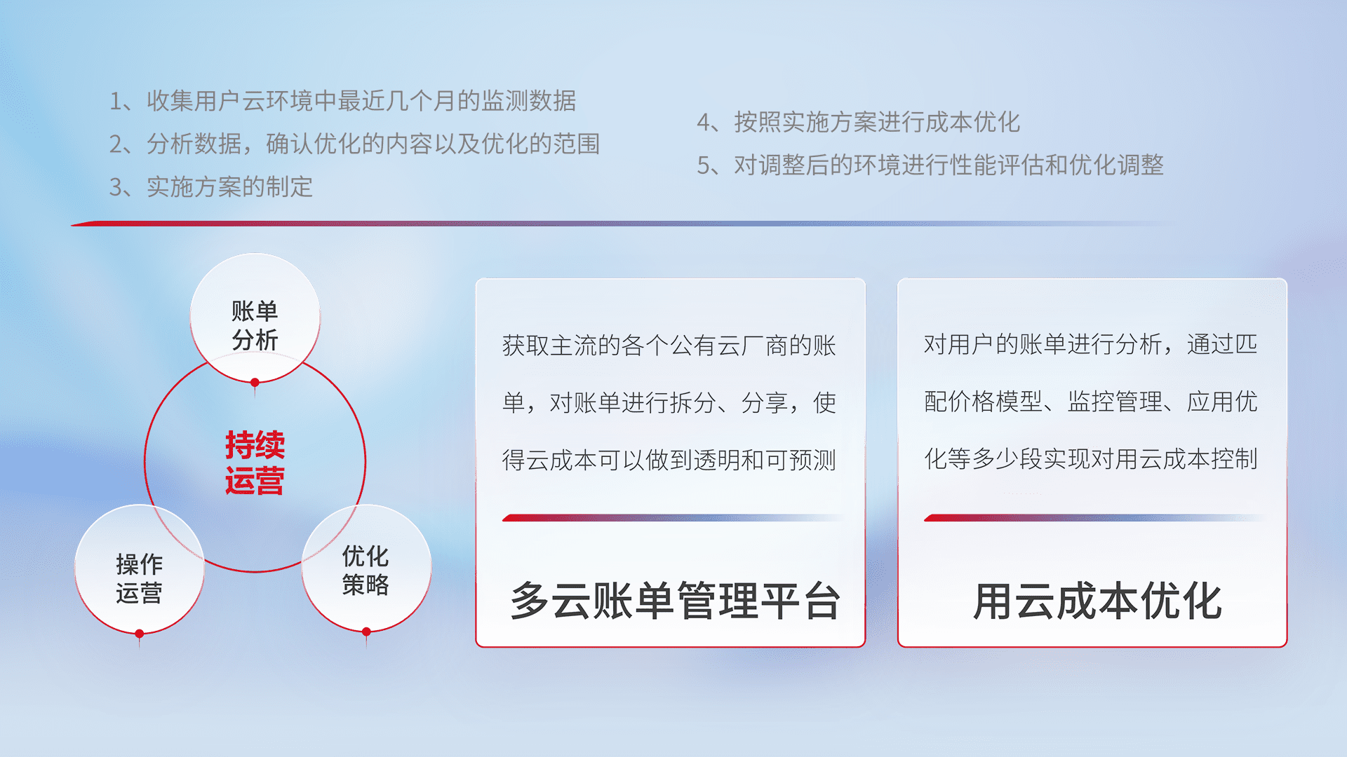 通过灵活运用多种自动化迁移工具,,,,帮助企业用户实现业务和数据高效 、、稳定的上云迁移和云上迁移,,,采用自研多云纳管平台,,以中立管理模式,,,解决多组织、、、多云、、多运维厂商的复杂关系的管理,,,,保证多云平台资源配置的一致性,,,,实时掌控云资源运行数据,,,运用智能化工具分析云资源多云平台的管理服务,,透明化管理成本支出,,用云成本可预测、、用云费用可优化、、、、云资源配额有据可依。。。