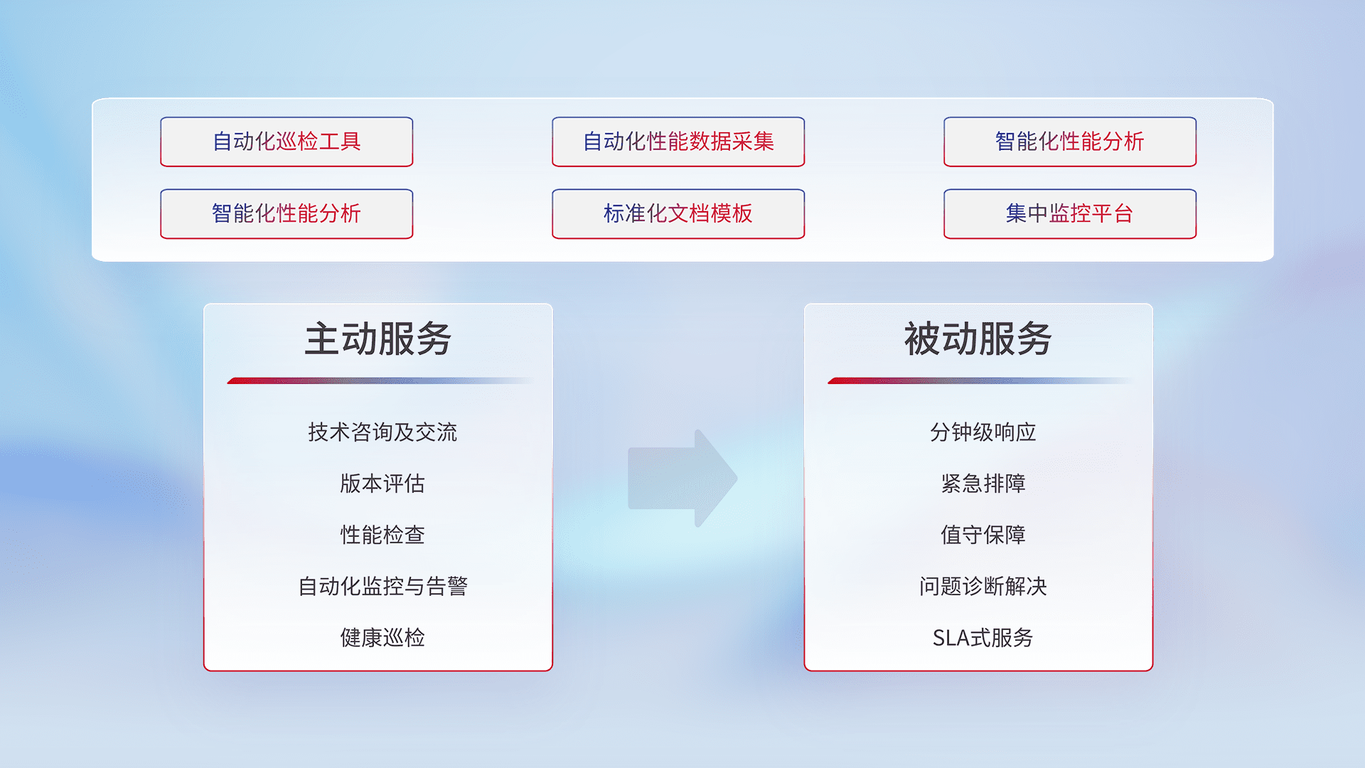智能化工具和标准化文档,,,,保障服务质量,,,,提供主动服务(包含技术咨询、、版本评估、、性能检查、、、、自动化监控与告警、、、健康巡检)和被动服务包含(分钟级响应、、、紧急排障、、、值守保障、、、、问题诊断解决、、、SLA服务)。。。。